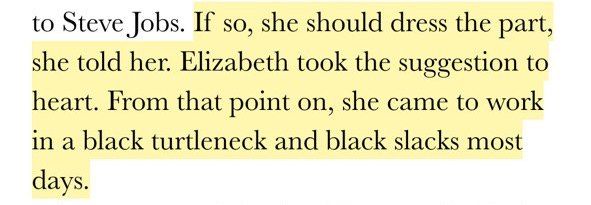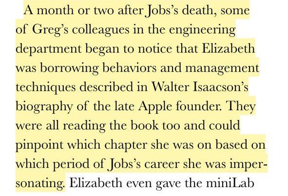 По тому, как Элизабет Холмс вела себя в офисе, её подчинённые могли узнать, на какой странице биографии Джобса она сейчас. И сегодня, вся первая страница выдачи гугла по запросу «Steve Jobs wannabe» — её портреты и упоминания.