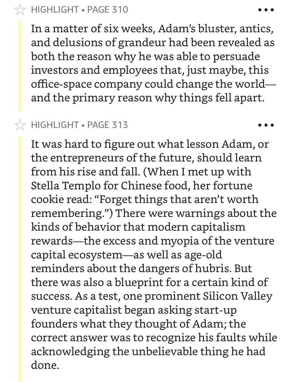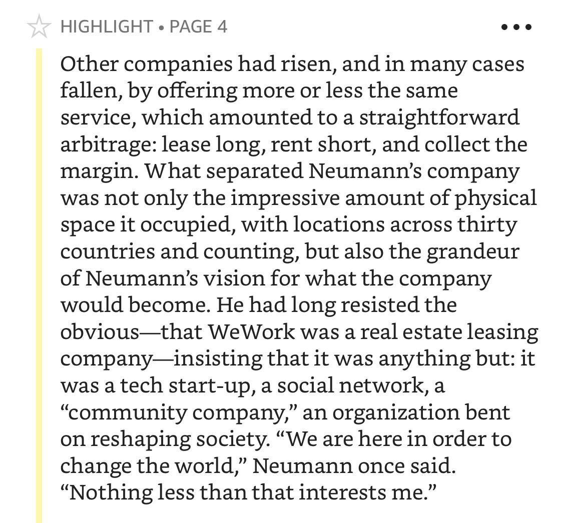 Этот пункт совсем про философию. История WeWork, это как бы cautionary tale, мол посмотрите, каких дров можно наломать, если не быть осторожным в своих амбициях и игнорировать реальность. Но по факту: чел всё же построил какой-то работающий бизнес (WeWork работает до сих пор), прожил фантастические 10 лет с особняками, личными самолётами и вечеринками. А в конце вышел с парашютом в миллиард, за который ему ещё предстоит посудиться, впрочем. При таких результатах — какой вообще смысл быть хоть сколько-то осторожным и хоть на секунду задумываться о разумности своих амбиций?
