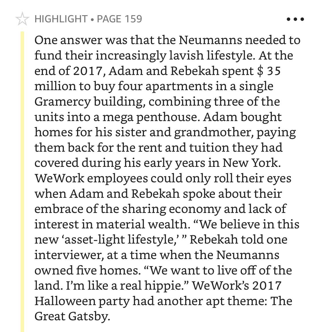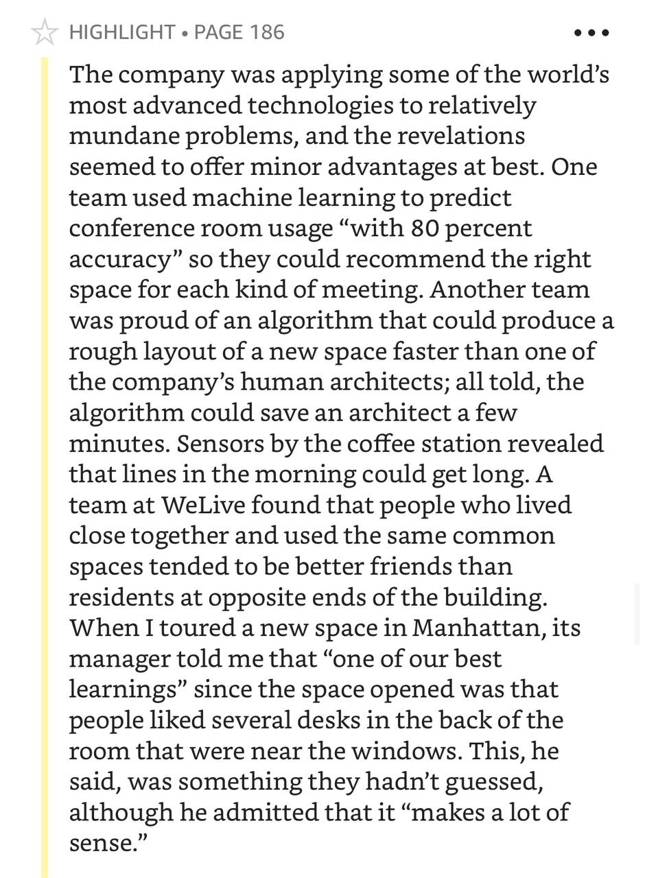 - Чтобы в момент кризиса быстро выстроить компанию до состояния too big to fail нужно много денег. И он придумал способ как присосаться к индустрии, которая не жалеет денег на убыточные, но растущие бизнесы. Из компании, которая снимает и сдаёт помещения, WeWork вдруг стал «физической социальной сетью» и «операционной системой для жизни»