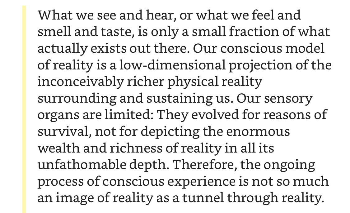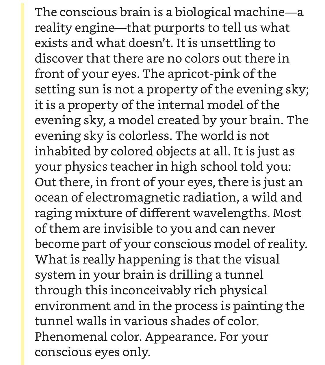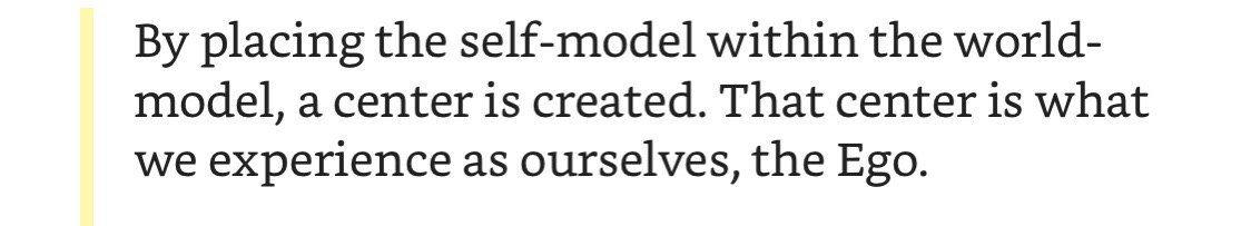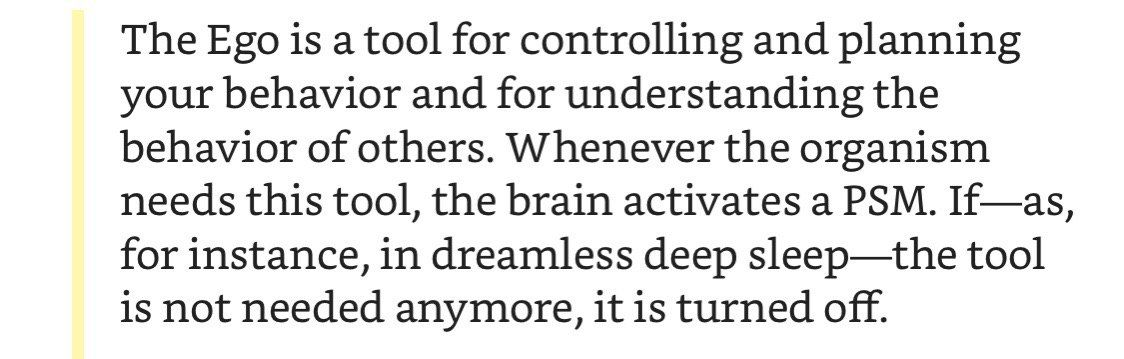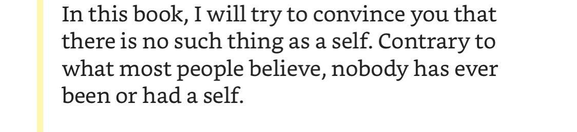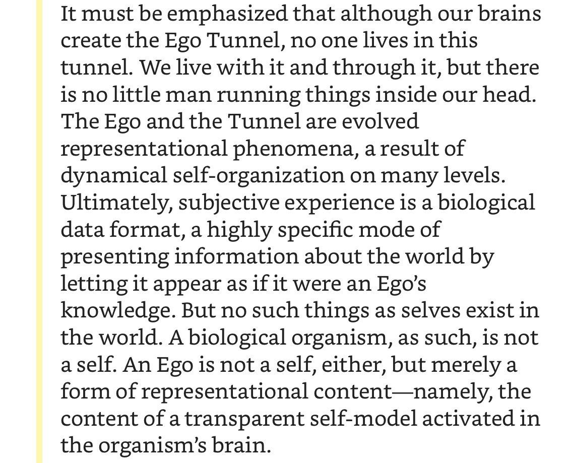 Ключевой посыл книги: никто и никогда не был собой, потому что никакого «собой» не существует. Сознание это не человечек в голове, не объект, а биологический процесс в мозгу, который по некоторым эволюционным причинам обрёл форму повествования от первого лица.