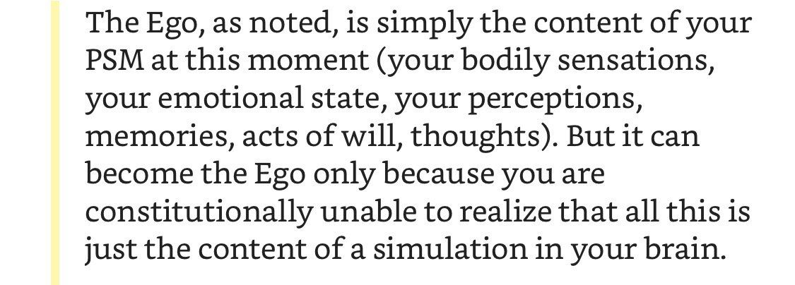 Ключевая заслуга Метцингера в том, что он пытается приземлить философские концепции сознания разной степени дряхлости на рельсы сегодняшней нейробиологии и западного научного метода в целом. Попутно очертив некое целостное повествование вокруг загадки нашего Эго. Объясняется это всё настолько понятно, насколько возможно. Гораздо понятнее, чем я тут с этой шкалой.