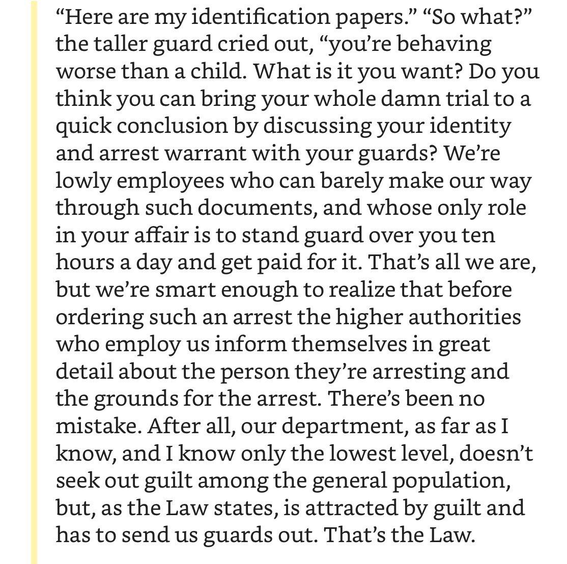 So which interpretation is the right one? Any. All of them. Same as it is with “The Metamorphosis”, it is a meaningless question. What’s the right interpretation for a parking ticket crumpled in your hand?