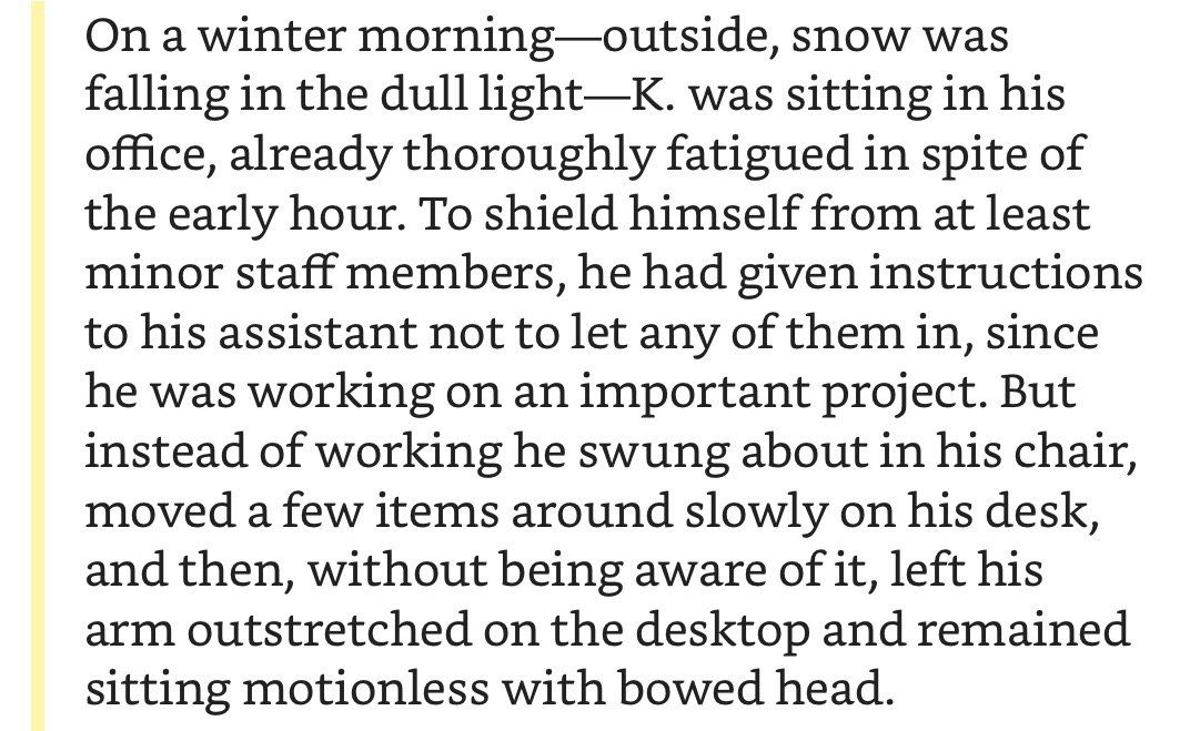 Such descriptions resemble depressive and anxiety disorders so much. And given Kafka’s biography and that you can find similar things in his other works, I doubt it’s a coincidence.