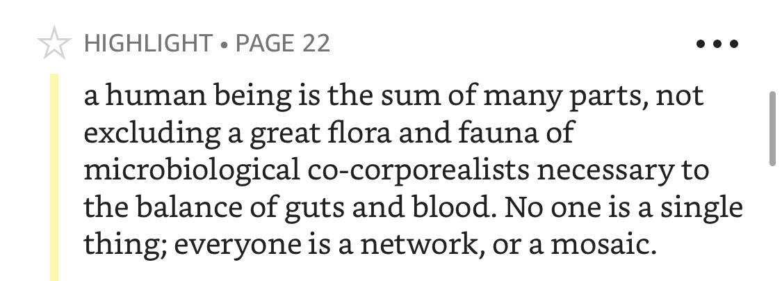 Идея вторая, известная всем, кто слушал Алана Уоттса. Очевидная граница между «мной» и «внешним миром» — граница моей кожи — самый интуитивный способ идентифицировать себя как субъекта. Интуитивный и обманчивый. Стоит задуматься над ней на минуту и идея о такой границе рассыпается. С тем, что мы считаем «собой», она не сильно-то связана да и граница эта очень прозрачная. Алгоритмы соцсетей через глаза в прямом смысле меняют химический состав мозга и карту нейронных связей, запах выпечки стимулирует слюнные железы и выработку желудочного сока, резкие звуки бьют не только по ушам, но и по надпочечникам. Сложно составленный текст про лабиринты чужих мозгов, поселяется в нашей памяти и начинает там жить своей жизнью.