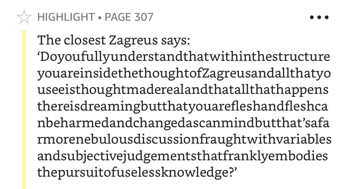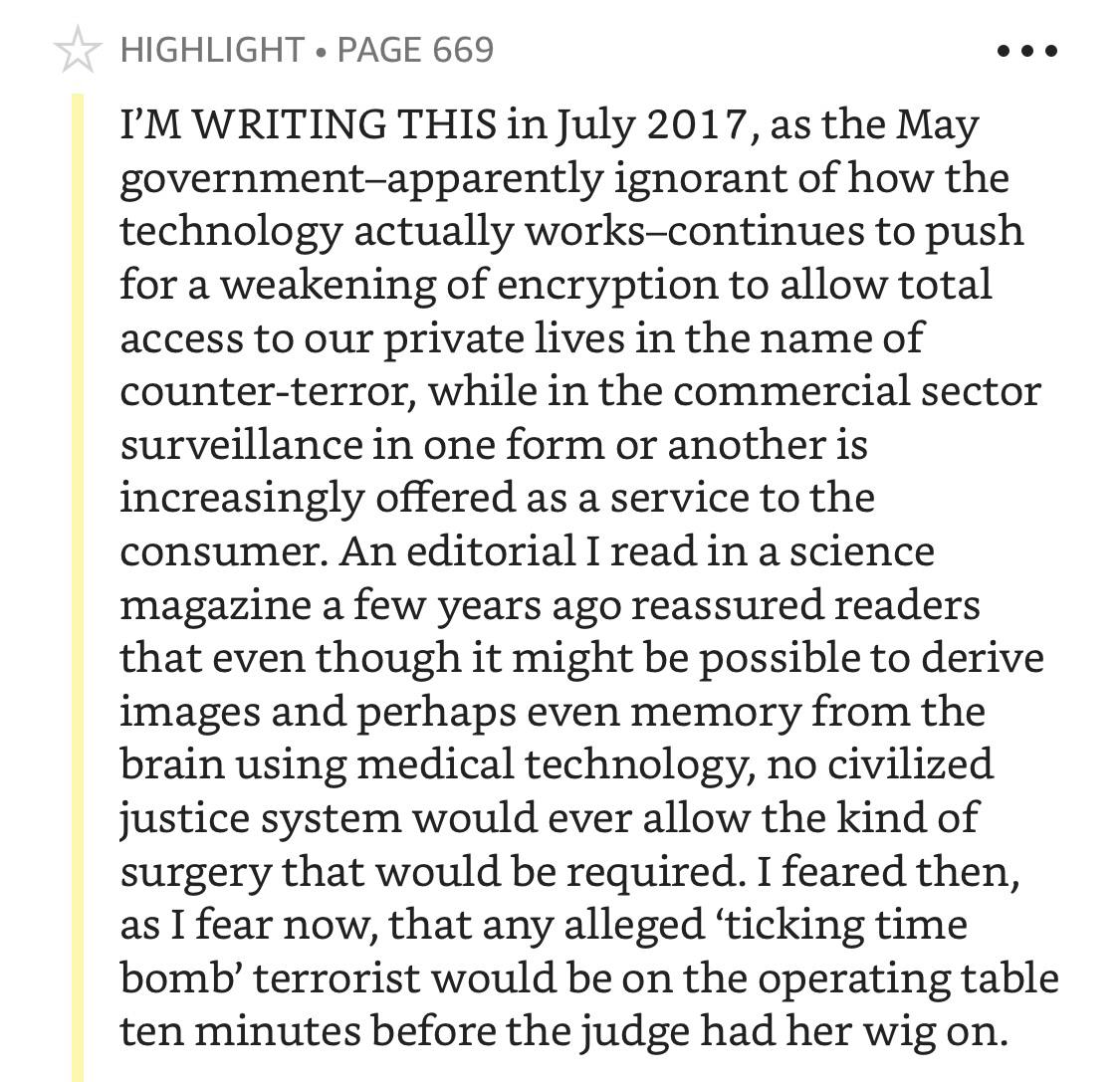 Нечто похожее есть у Митчела в Облачном атласе, но там оно непонятно зачем и даже близко не так сложно устроено. Харкауэй знает, что нужно делать с текстом в книге, поэтому такая композиция не воспринимается как циркачество.