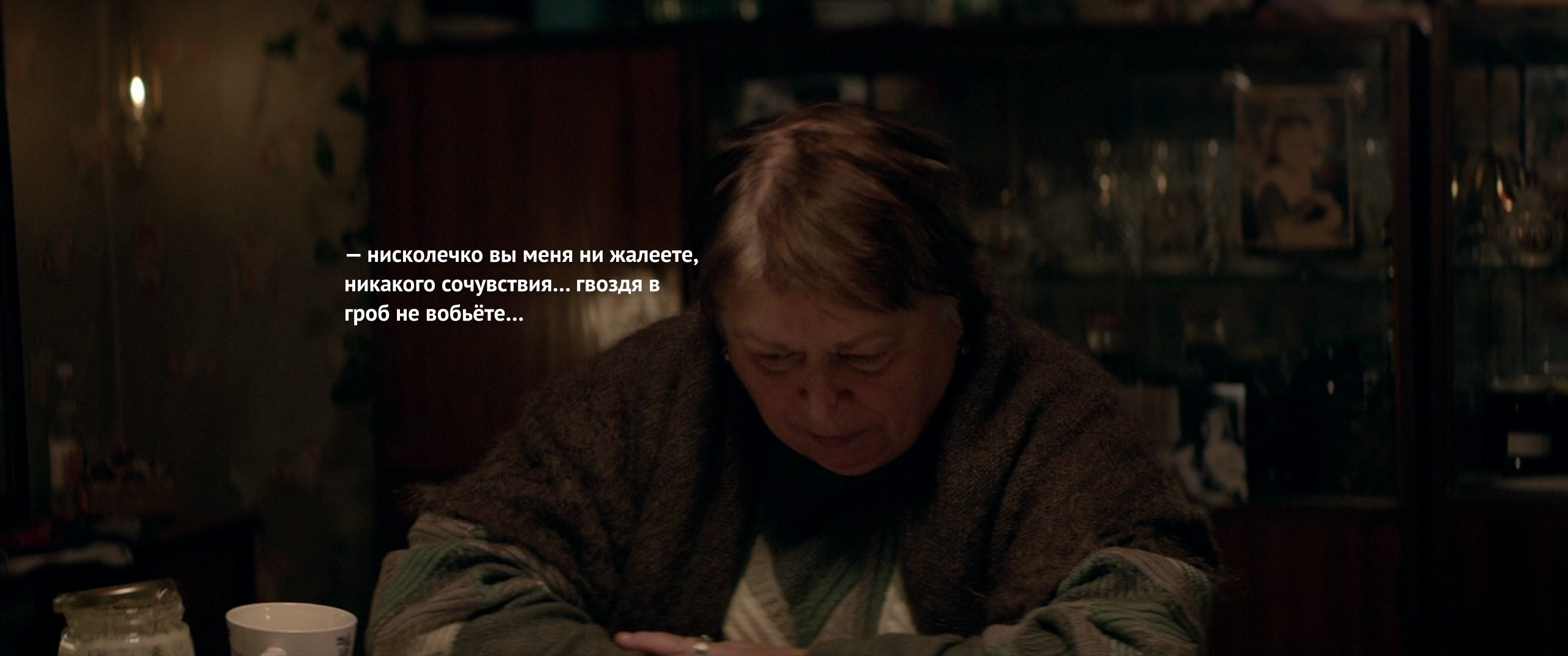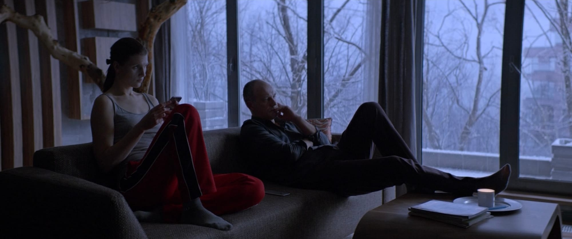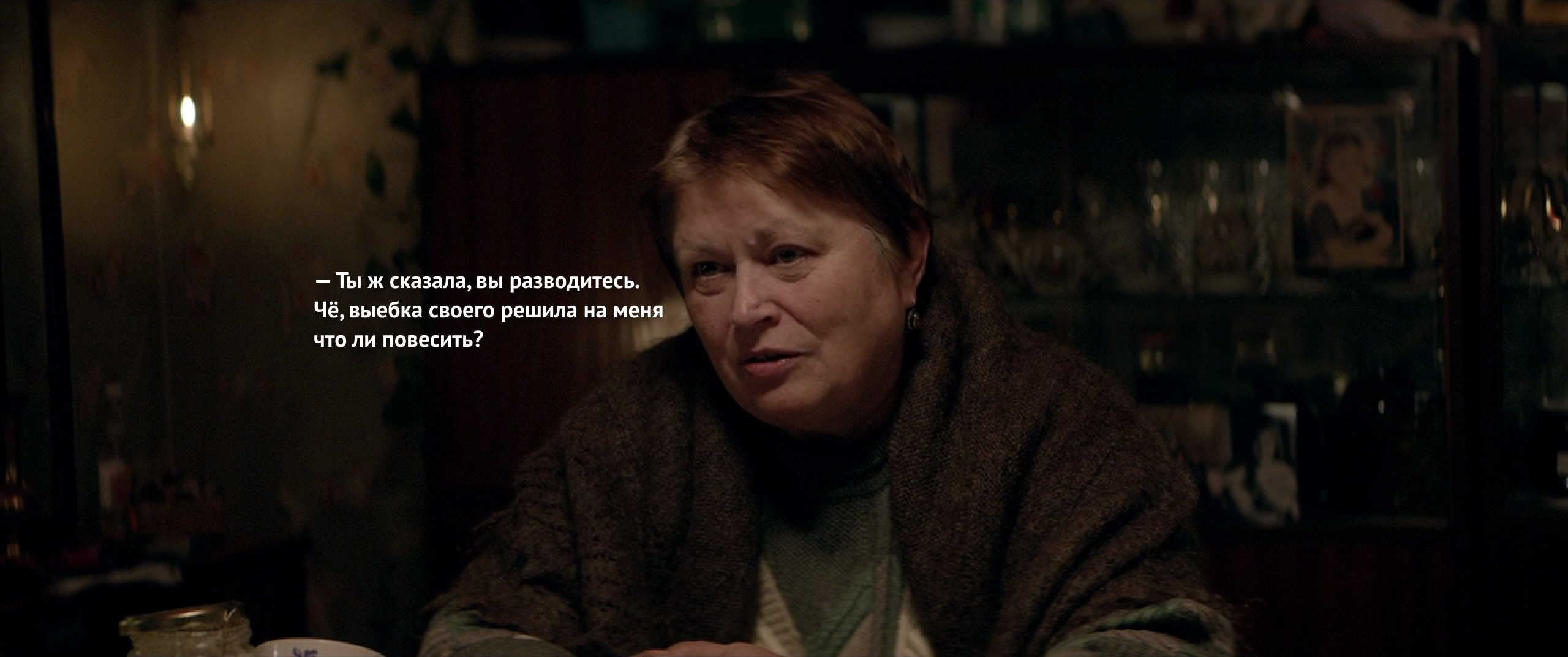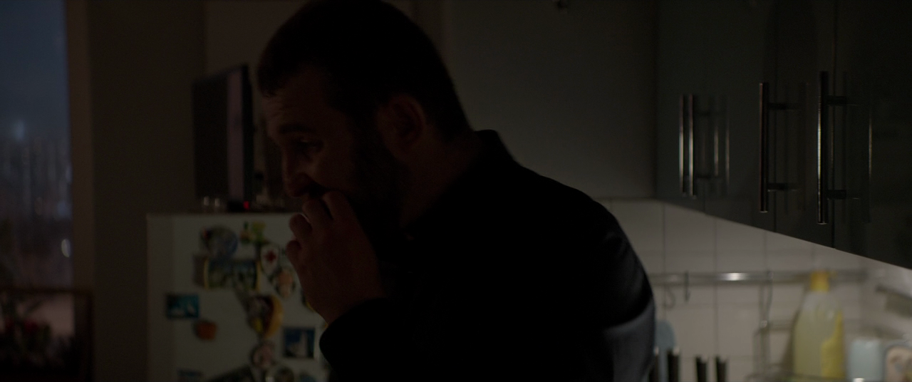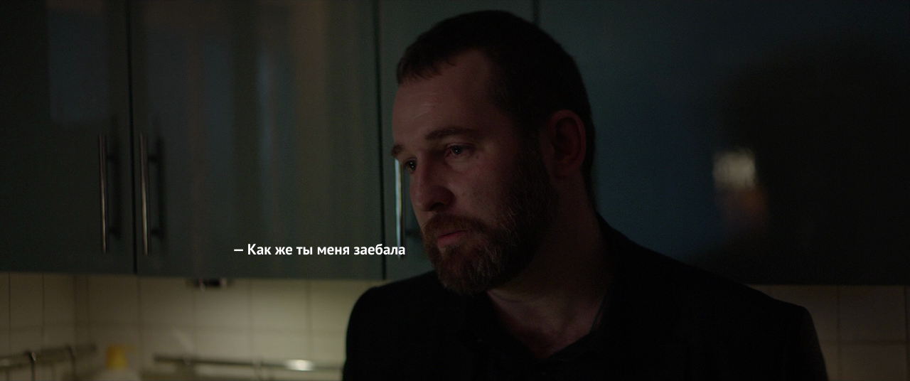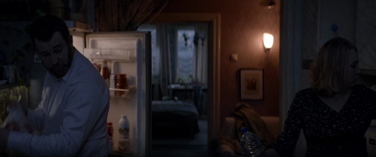 Здесь самое время натянуть вторую сову на глобус. Свет в кадре как правило подсвечивает (бадум-тс) динамику отношений в сцене. Ну то есть понятно, что это и так по умолчанию происходит в каждом кадре каждого более менее нормально снятого фильма. Но в Нелюбви есть более конкретные правила. Лучше всего их видно на примере «счастливой пары» главных героев и конкретно матери Алёши. Звягинцев, кажется, подарил ей чуть больше способности чувствовать хоть какие-то чувства, поэтому сцены с ней выглядят вот так.