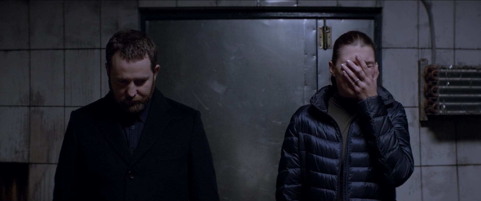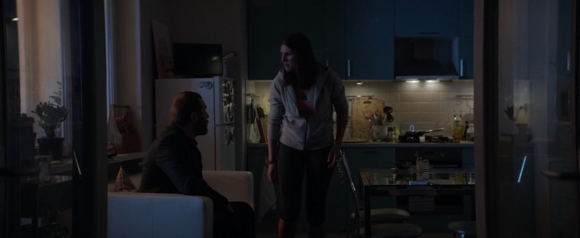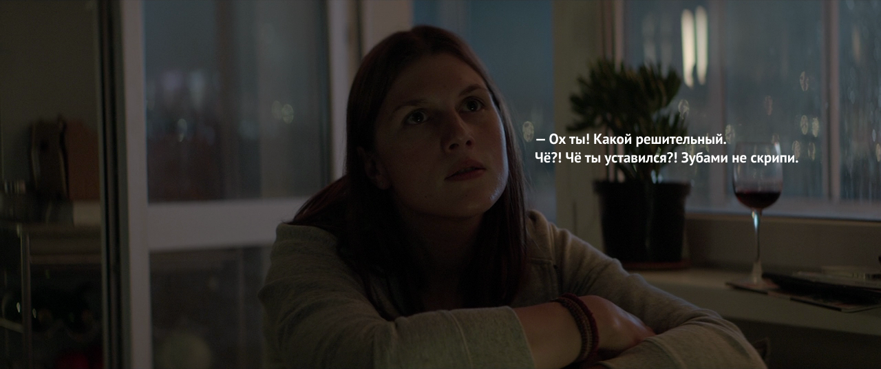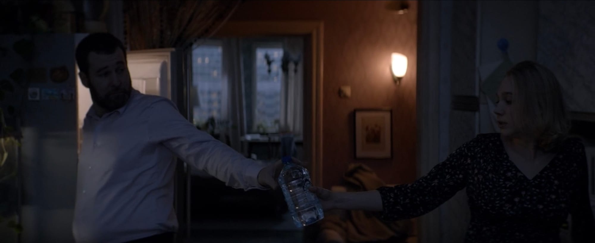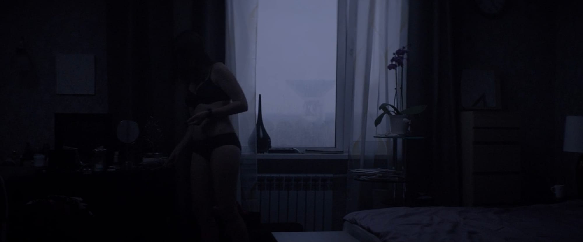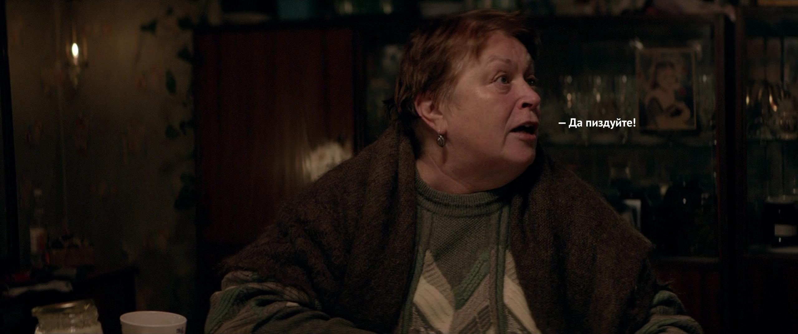 Здесь самое время натянуть вторую сову на глобус. Свет в кадре как правило подсвечивает (бадум-тс) динамику отношений в сцене. Ну то есть понятно, что это и так по умолчанию происходит в каждом кадре каждого более менее нормально снятого фильма. Но в Нелюбви есть более конкретные правила. Лучше всего их видно на примере «счастливой пары» главных героев и конкретно матери Алёши. Звягинцев, кажется, подарил ей чуть больше способности чувствовать хоть какие-то чувства, поэтому сцены с ней выглядят вот так.