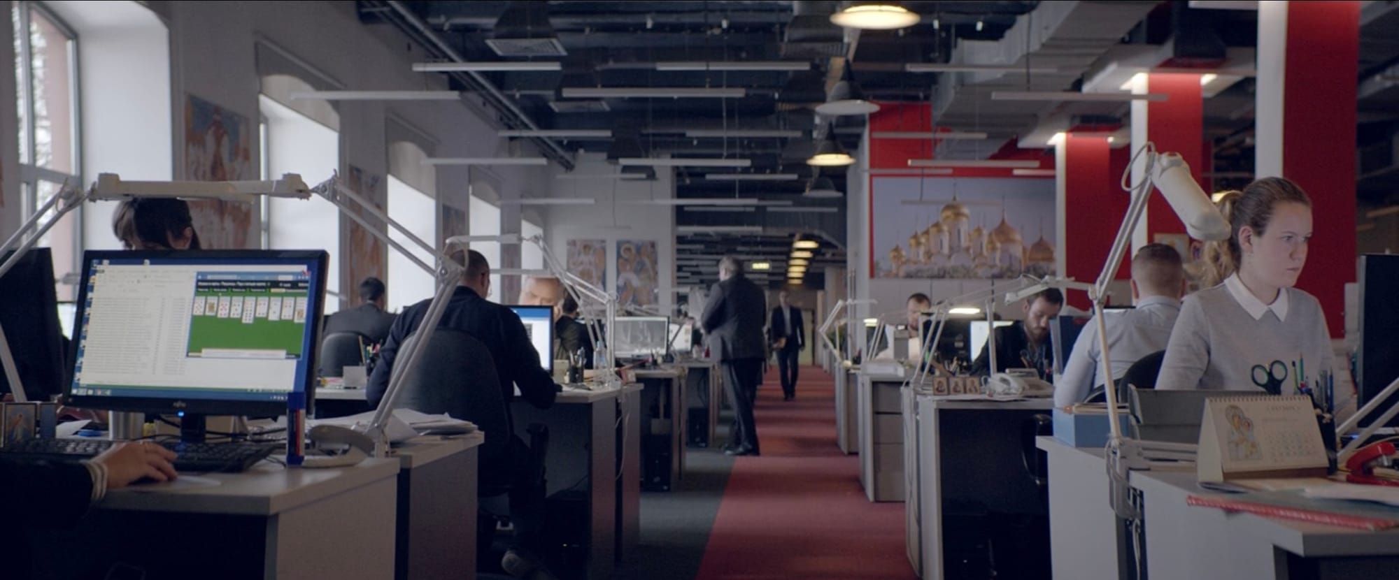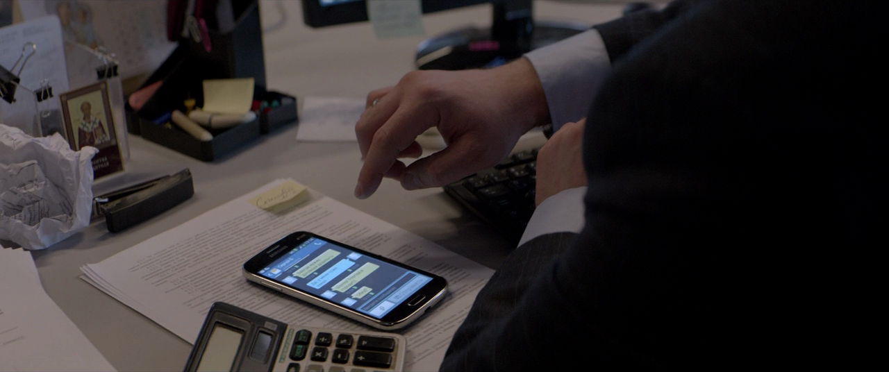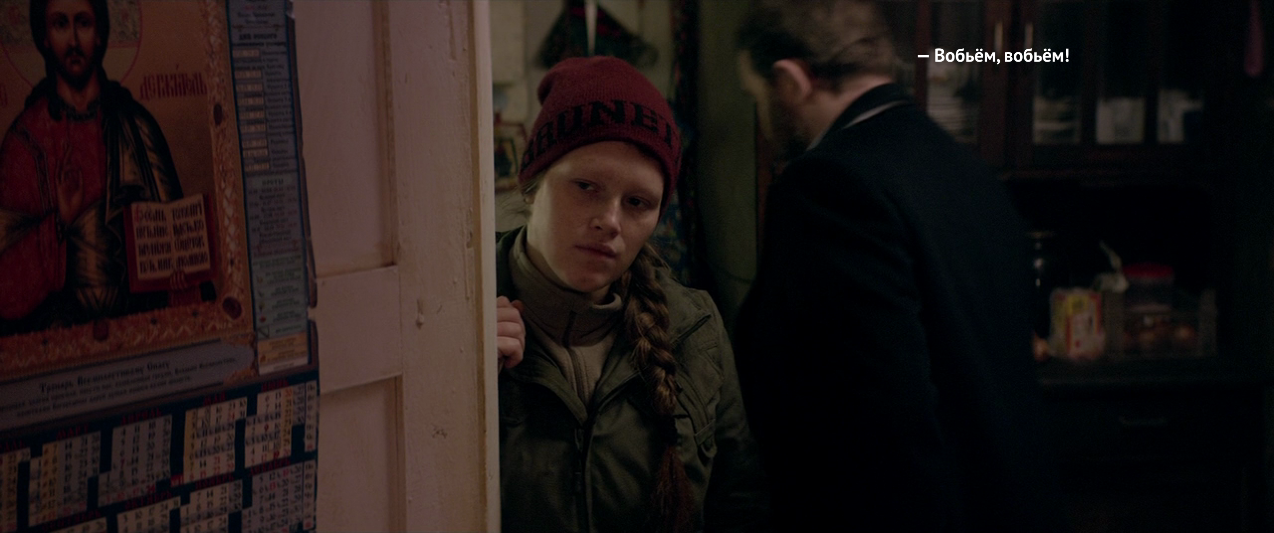 Ещё обязательный пункт программы Звягинцева — проехаться по РПЦ. Левиафан чуть ли не весь про это, в Нелюбви же троллинг более тонкий. Например, в виде надписи «отдел продаж» на двери помещения увешанного «иконами». Или в разных календариках с православной символикой, которые привязаны к самым неприятным персонажам (на столе у мужа в скриншоте выше).