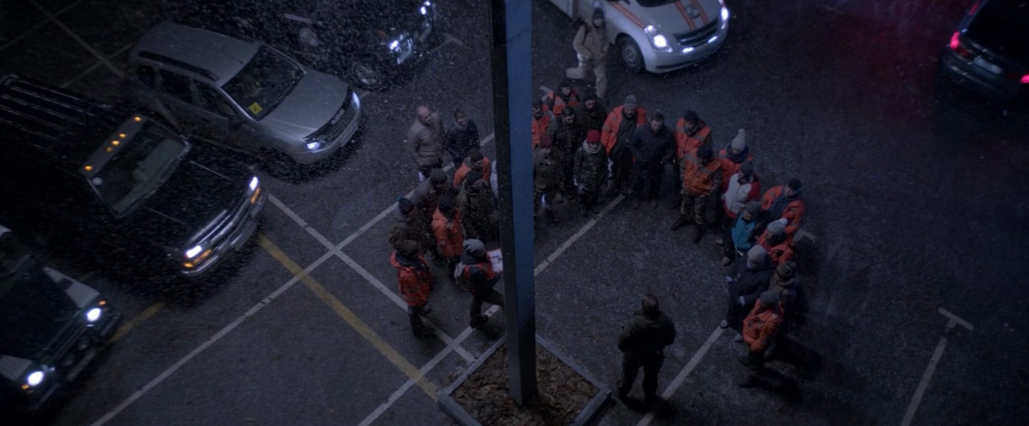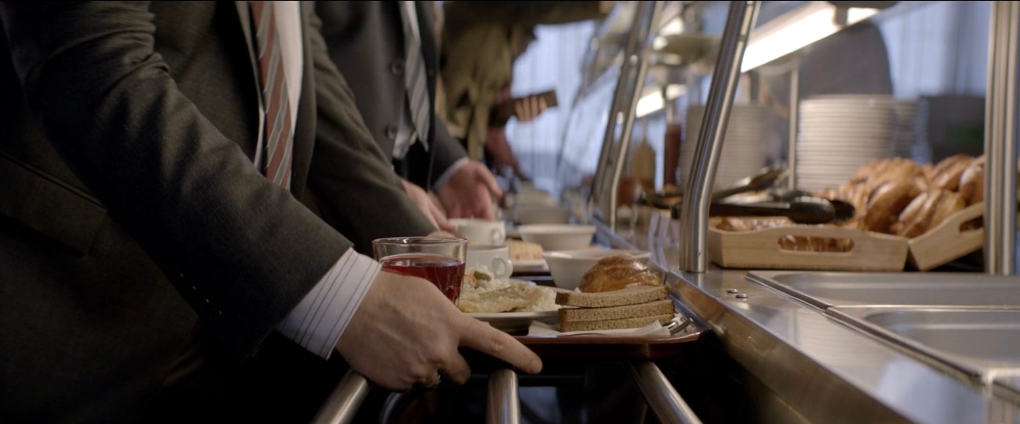 Конвейеры ещё и важны как фон для представления главного кризиса на экране. Звонок о пропаже мальчика застаёт отца на фоне самой рутинной сцены из возможных — в очереди за хавкой в столовке.