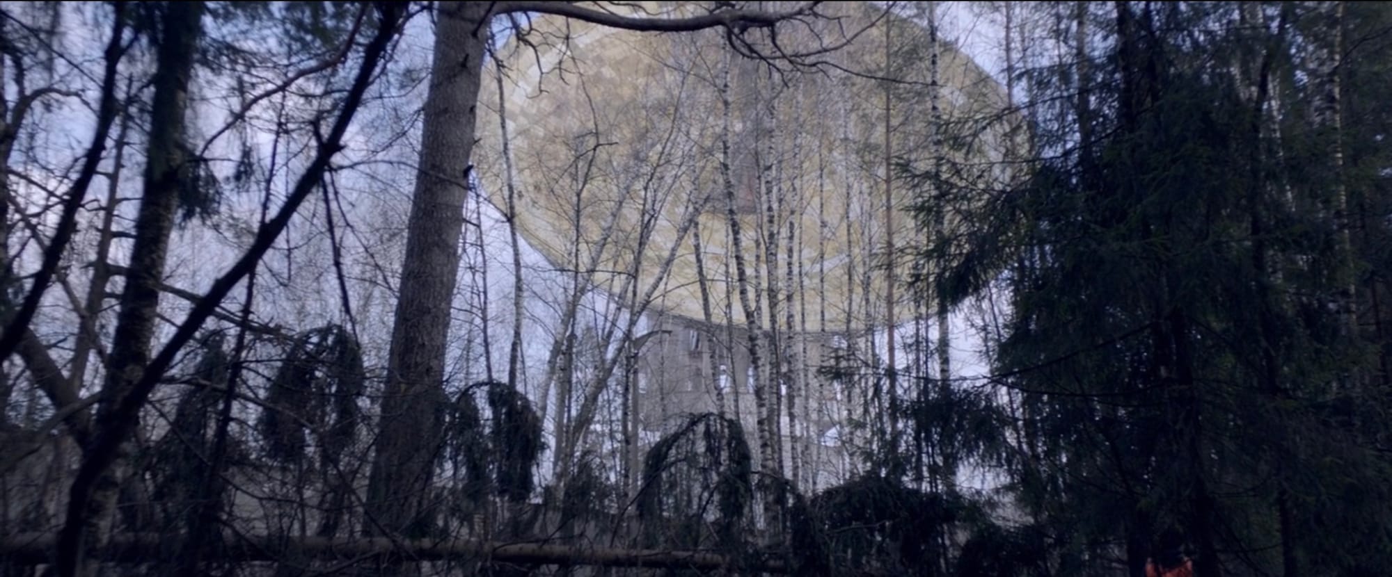 Последний мотив — облучение пропагандой. Может показаться, что я просто сделал скриншот с раздетой женщиной, но если посмотреть в окно, мы увидим, что там гигантская тарелка. Которая затем будет нависать над поисковой группой. А после бравый полицейский сообщит нам, что за забор поближе к тарелке — нам нельзя.