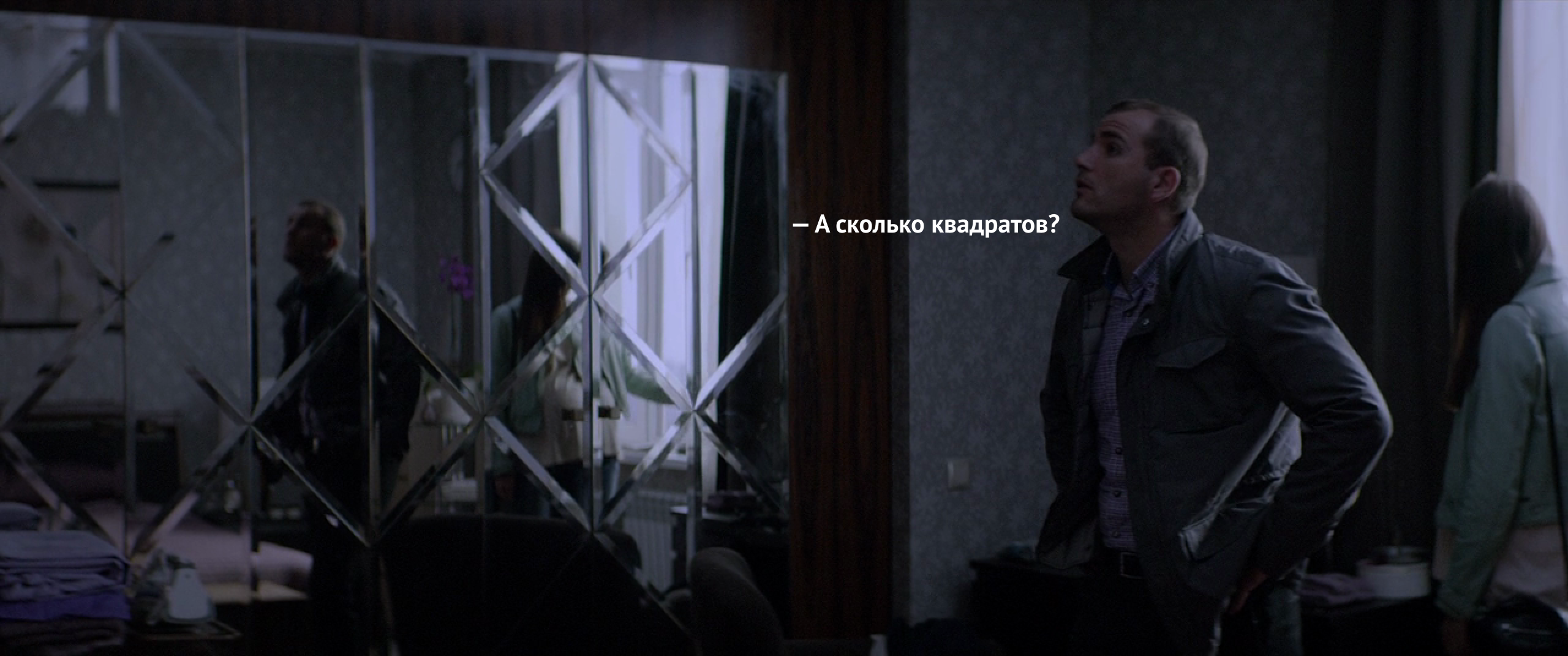 Но если мы будем не только смотреть, но ещё и слушать, то мы встретимся с этой темой чуть ли не в первом диалоге фильма — покупатели квартиры общаются исключительно техническими характеристиками жилплощади.