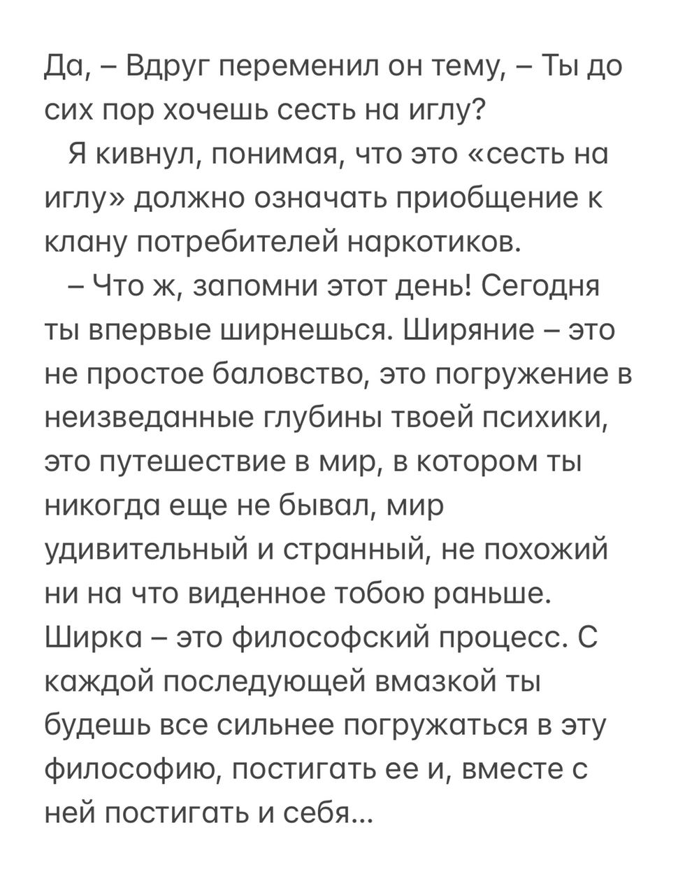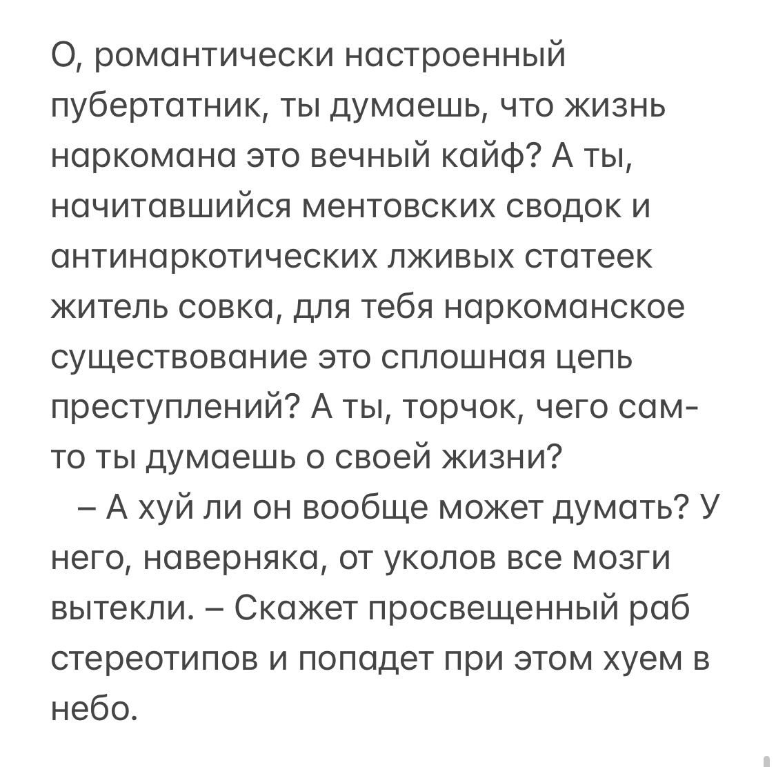 Навотно Стоечко и Семарь-Здрахарь (имена двух из дюжины героев) уже в той же исторической категории, что и чиновники у Гоголя — какие винтовые наркоманы в 2020 господи. Но языковой опыт, который содержится в книге, кажется продержится сильно дольше. Сегодня это уже не про наркоманов истории, это история про путешествие по языку. Подобно Элджернону Киза, в первых главах ты не понимаешь целые предложения. Но по мере продвижения термины проясняются, дорога под ногами всё твёрже и твёрже — ко второй трети ты уже рука об руку с торчками идёшь по великому джефовому пути за терками и стендалем, чтобы потом растянуть баян со струнами.