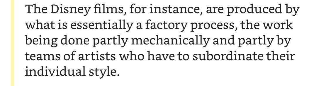 «Дисней производит свои фильмы фабричным, по сути, методом», предложение в равной степени принадлежащее обзору на последний фильм из MCU и критике капитализма из 1946-го года.