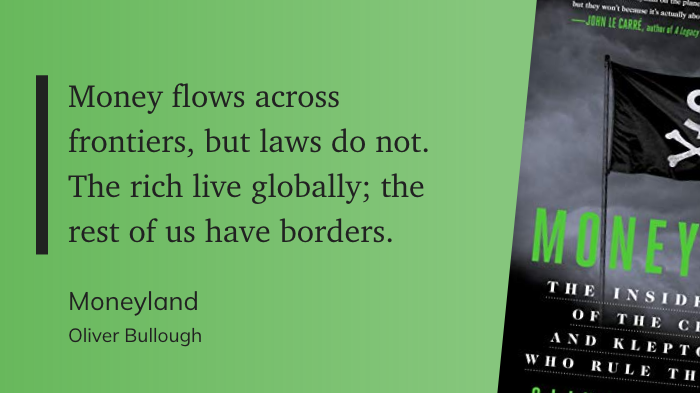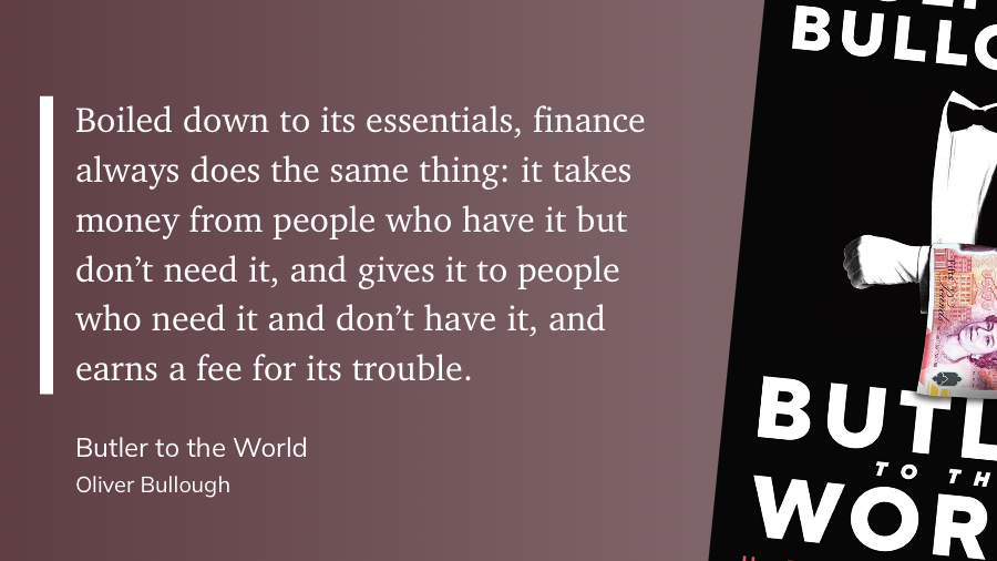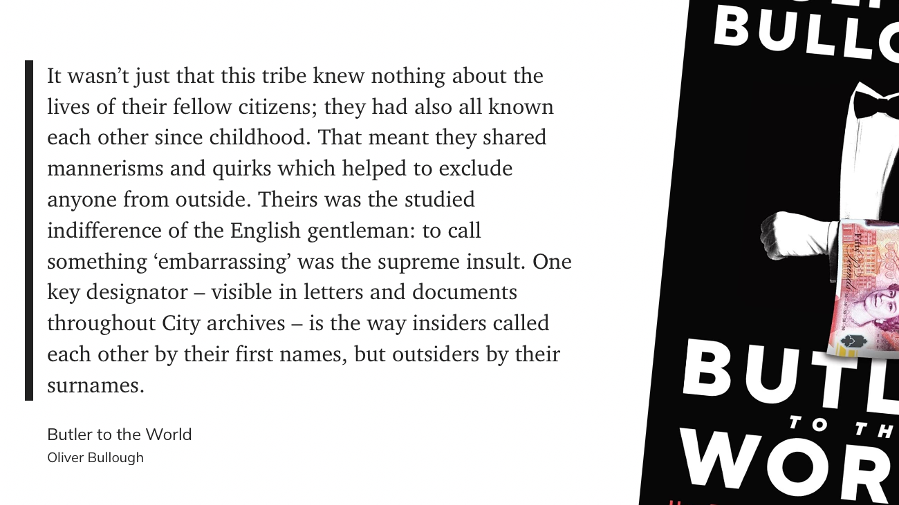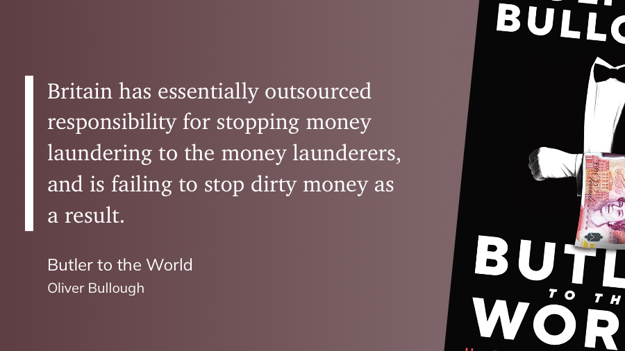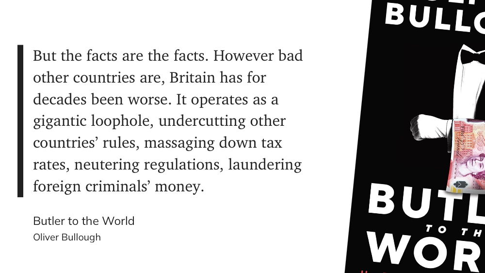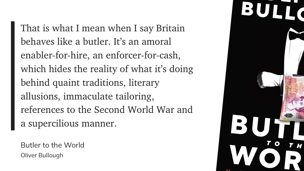 Что-то вроде сиквела предыдущей книги, в этот раз с фокусом на одной конкретной стране — Британии. Коротко, тезис предыдущей книги — Moneyland: «границы это для простых крестьян, для господ и их состояний никаких границ не существует». В книге Butler to the World Оливер Буллоу рассказывает как так вышло, и кто эту инфраструктуру построил.