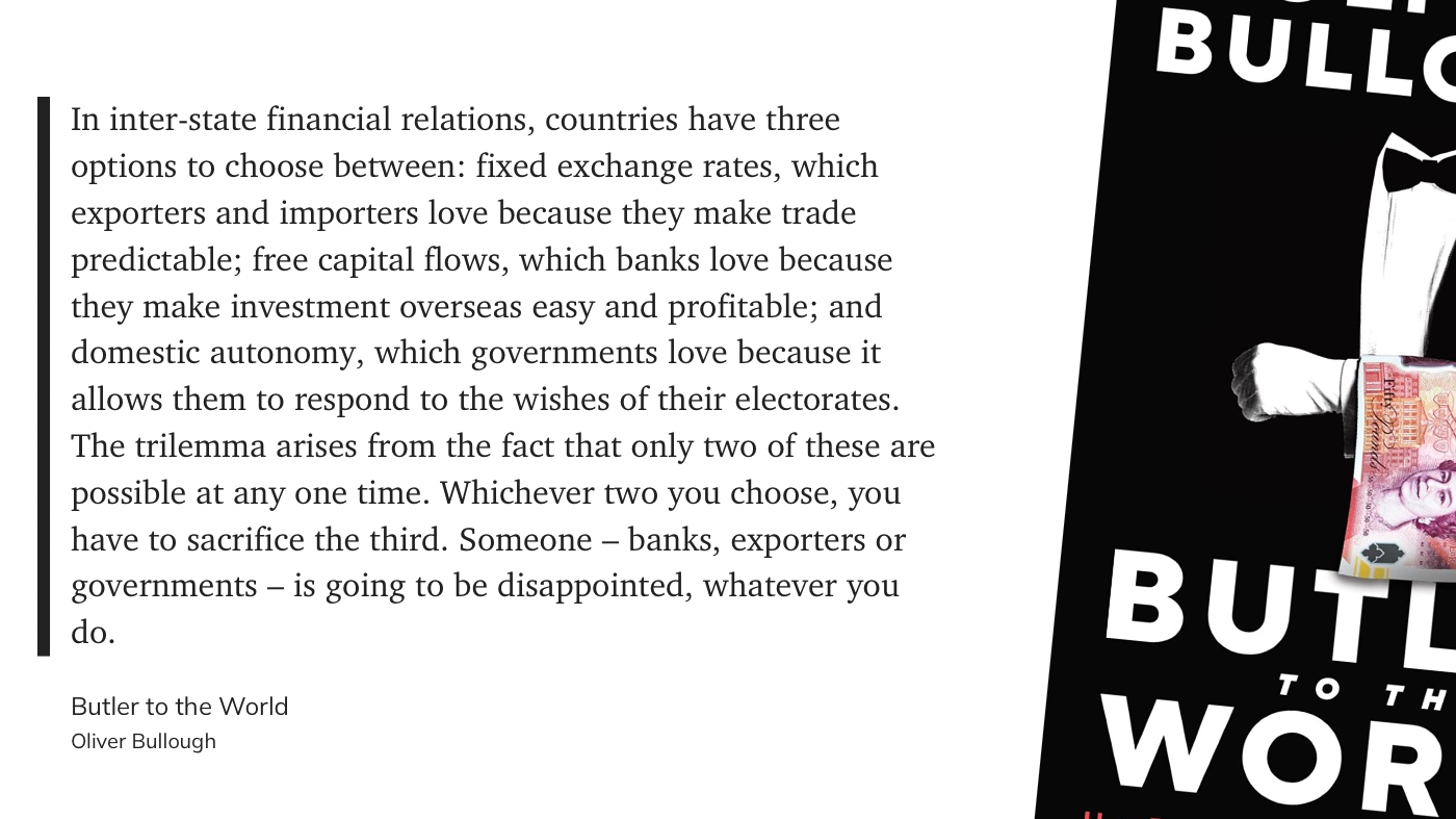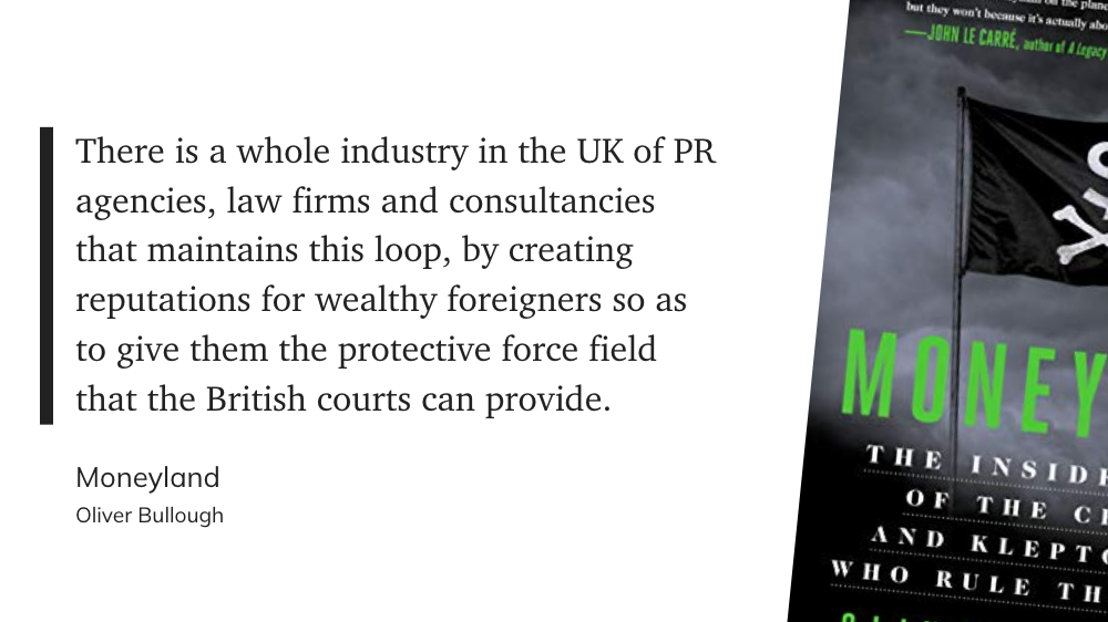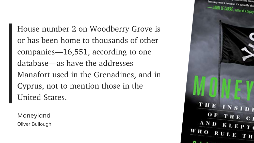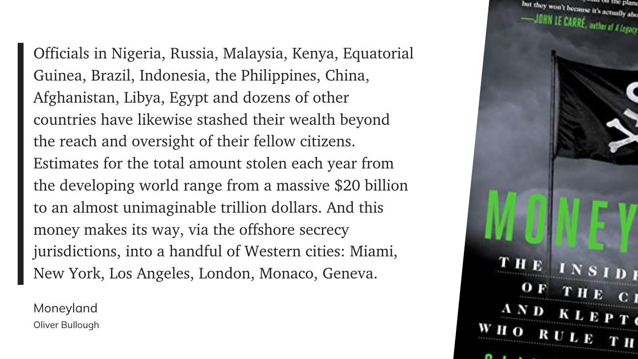 Что-то вроде сиквела предыдущей книги, в этот раз с фокусом на одной конкретной стране — Британии. Коротко, тезис предыдущей книги — Moneyland: «границы это для простых крестьян, для господ и их состояний никаких границ не существует». В книге Butler to the World Оливер Буллоу рассказывает как так вышло, и кто эту инфраструктуру построил.