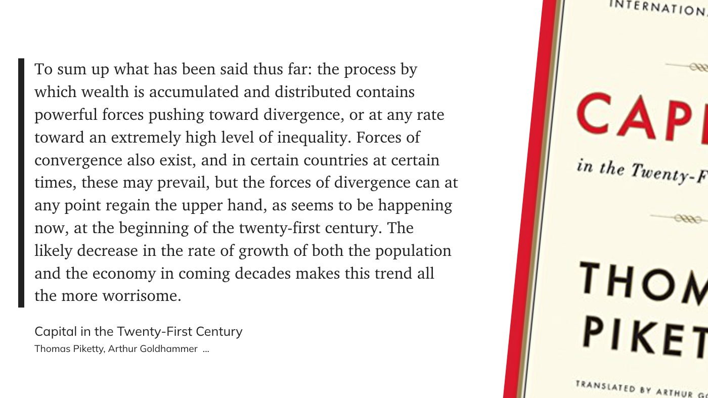 Это та самая книжка, которая для восприятия простой не выглядит. В ней очень простая идея: предоставленный сам себе рост капитала всегда будет обгонять рост экономики, что всегда будет приводить к экстремальному финансовому неравенству.