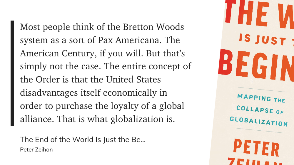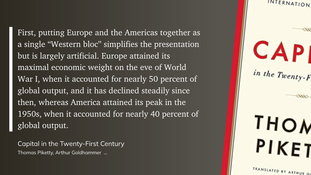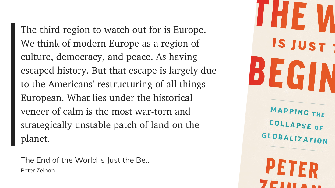 Дальше автор развивает мысль в то, что просто по факту географии и отношений с соседями у США всё будет в порядке (воспроизведут хорошую систему с распределением труда но помельче), Европа снова утонет в войнах, а Китай догонят последствия политики одного ребёнка и работать там будет некому.